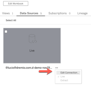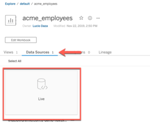 Seconde méthode : à partir de Tableau Online, sélectionnez Sources de données et vérifiez que la source de données indique Live