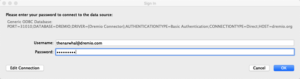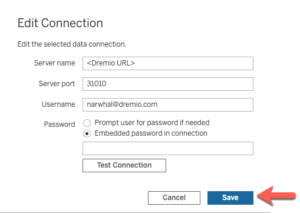 Ouvrez le fichier TDS et, lorsque vous y êtes invité, saisissez les mêmes informations d’identification que vous avez utilisées pour vous connecter à l’interface utilisateur Dremio.