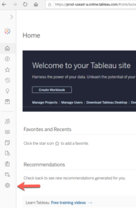 Maintenant sur votre navigateur, accédez à online.tableau.com et ouvrez le menu des paramètres en bas à gauche.