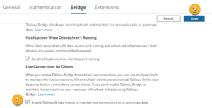 Cochez l’option : Enable Tableau Bridge clients to maintain live connections to on-premises data puis cliquez sur Enregistrer.