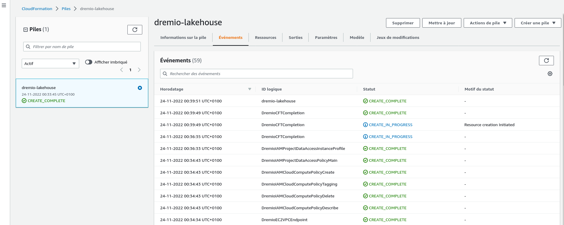 | Etape 8 : En quelques minutes, le statut de la pile devrait passer de CREATE_IN_PROGRESS à CREATE_COMPLETE. | |