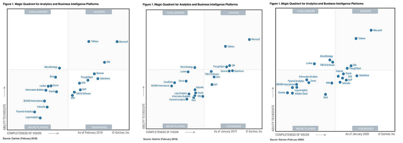 Qui dit benchmark des solutions BI, dit forcément Magic Quadrant de Gartner. Celui de 2020 étant sorti en janvier, nous avons pu comparer cette dernière année avec les deux années précédentes afin de constater les évolutions/migrations faites au cours de cette période.