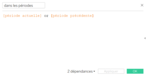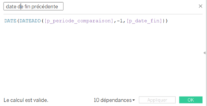 La problématique réside donc dans le fait que Tableau Software ne propose pas de fonctionnalités permettant de comparer différentes périodes. Il faut donc récupérer la période que l’utilisateur souhaite voir, puis y appliquer des fonctions pour obtenir la période précédente. Par la suite, sur le tableau de bord, il faut bien définir ce que souhaite voir l’utilisateur en premier lieu et les choix éventuels qu’il peut être amené à faire.