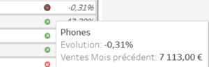 Par exemple, nous constatons une baisse sur la vente des téléphones de 0,31%. On peut donc décider de redresser la barre sur les prochains mois sur ce produit. Nous pouvons également voir que sur d’autres produits, le rendement est en amélioration. Par conséquent, on peut se satisfaire et continuer sur cette pente. Le but est vraiment de déceler les produits sur lesquels nous devons s’améliorer et sur lesquels nous pouvons marquer la progression.