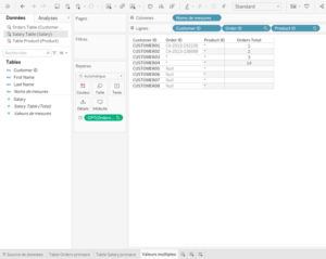 Pour avoir tous les clients, on va choisir les champs Customer ID et Salary de la table Salary, en premier pour mettre cette table en source primaire, puis choisir le nombre de commandes (Orders Table) de la table Orders.