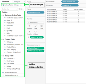 Une seule source de données est alors créée à partir d’une ou plusieurs sources indépendantes. Ainsi, il n’y a pas de problèmes de duplication des données avec cette méthode. Chaque table reste indépendante des autres et les agrégations ne sont faites que sur la mesure de la table la contenant.