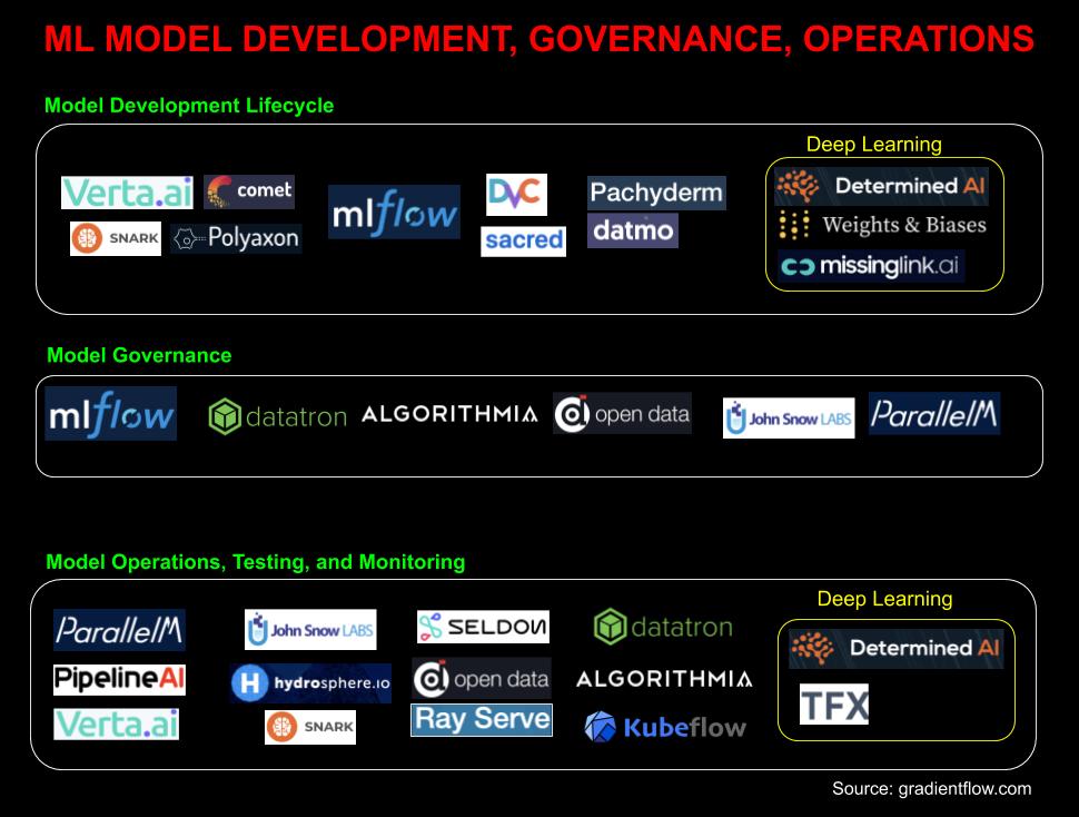 Figure 1 : Un ensemble d’outils centrés sur le développement de modèles, la gouvernance, et les opérations. Source : Ben Lorica