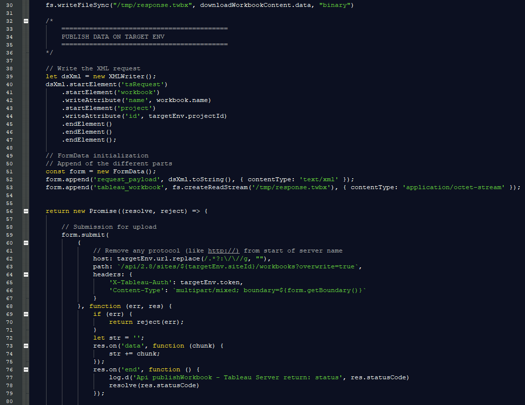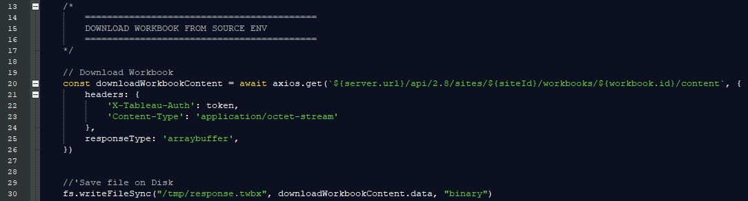 A partir de là, on va charger le contenu du workbook que l’on veut publier et ça va se faire en deux étapes : chargement du contenu (1er appel à l’API de Tableau Server pour aspirer le contenu du workbook sur un site particulier – siteId) et sauvegarde du contenu du workbook dans un fichier sur le disque (l. 30).