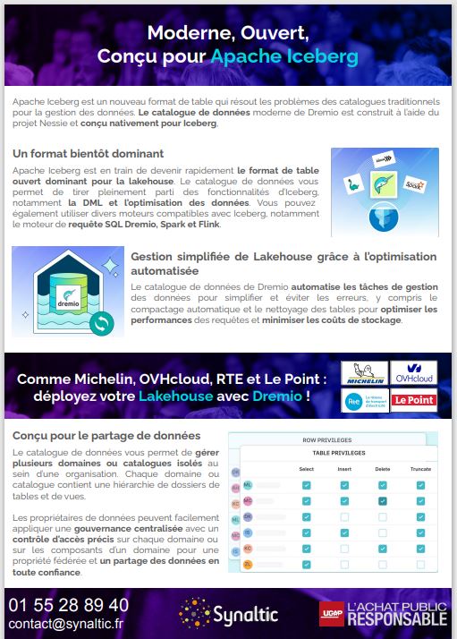 Depuis, Apache iceberg a été adopté par d’autres entreprises telles que Airbnb, Apple, Expedia, LinkedIn, Adobe, Le Point, La Poste, Michelin, Bic … Courant 2024, la spécification Iceberg est massivement adoptée par les éditeurs logiciels eux-mêmes, notamment Snowflake et Databricks.