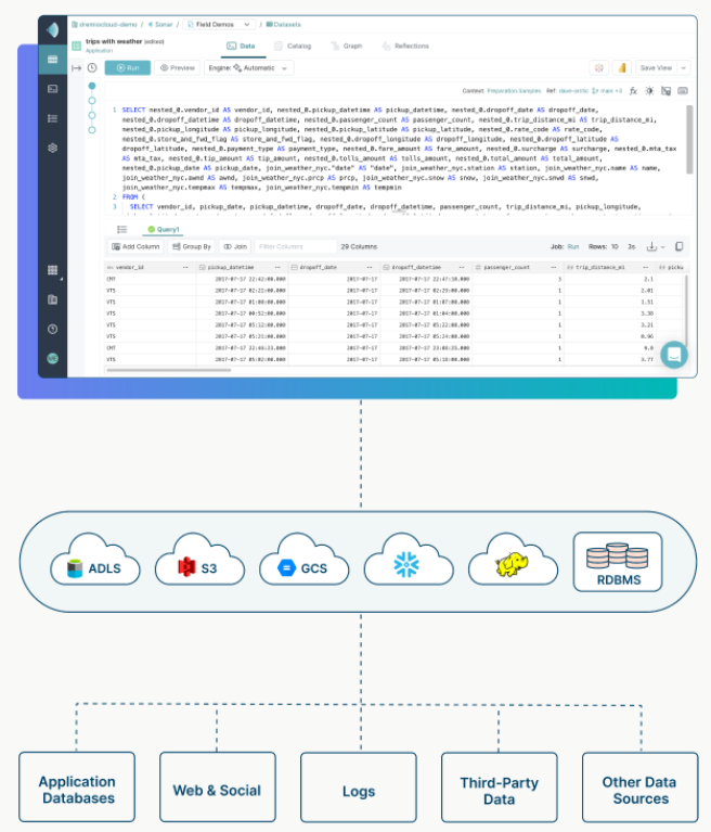 Avec Dremio, plus besoin de déplacer nos données dans des entrepôts de données ou de créer des extraits BI, des cubes et d’autres copies. Cela représente des gains de temps et d’argent et assure une meilleure flexibilité de votre architecture.